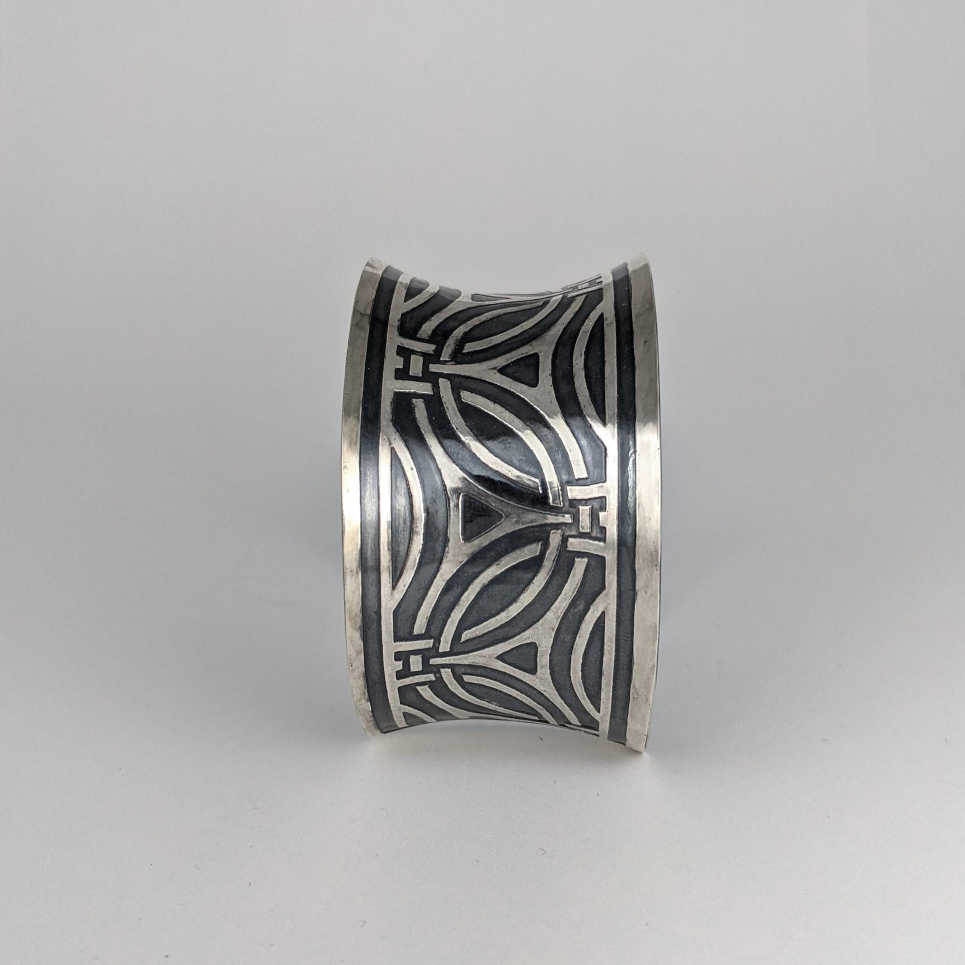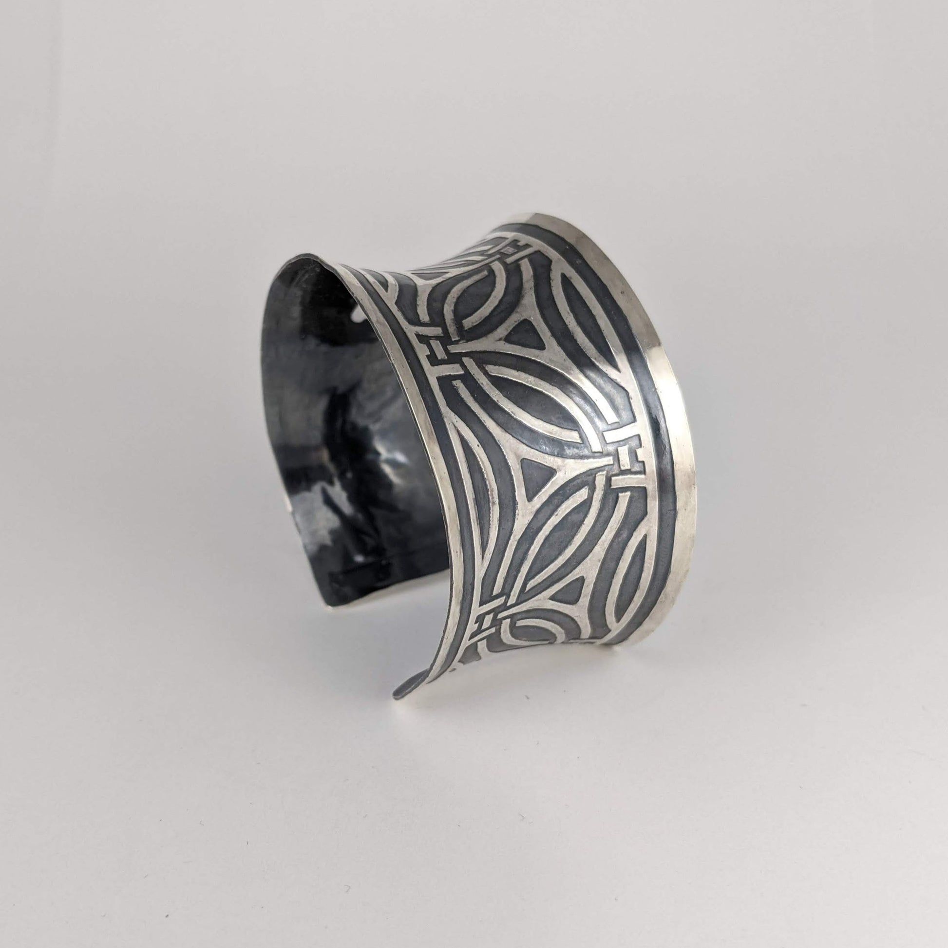 Sterling Silver Cuff wide art deco pattern etched & hand painted Black Pearl patina GemRapture Jewellery handcrafted in Canada
