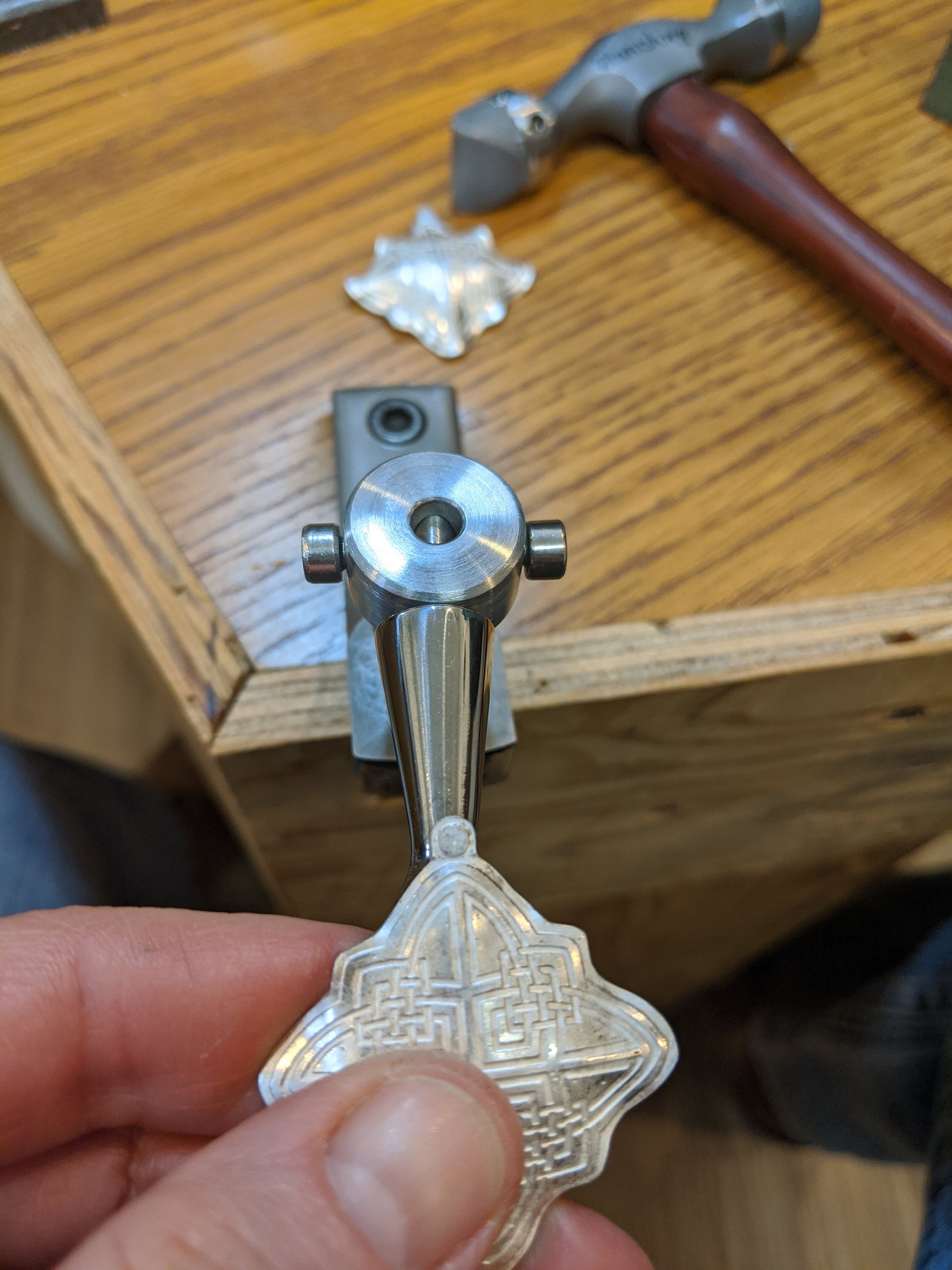 Inspired by this intricate Celtic pattern it was challenged to hold this delicate continuous pattern during the etching process. Transforming this from a flat surface to a 3D form by hand forming with miniature stakes and hammers. Truly a tactile eye-catching statement earring!