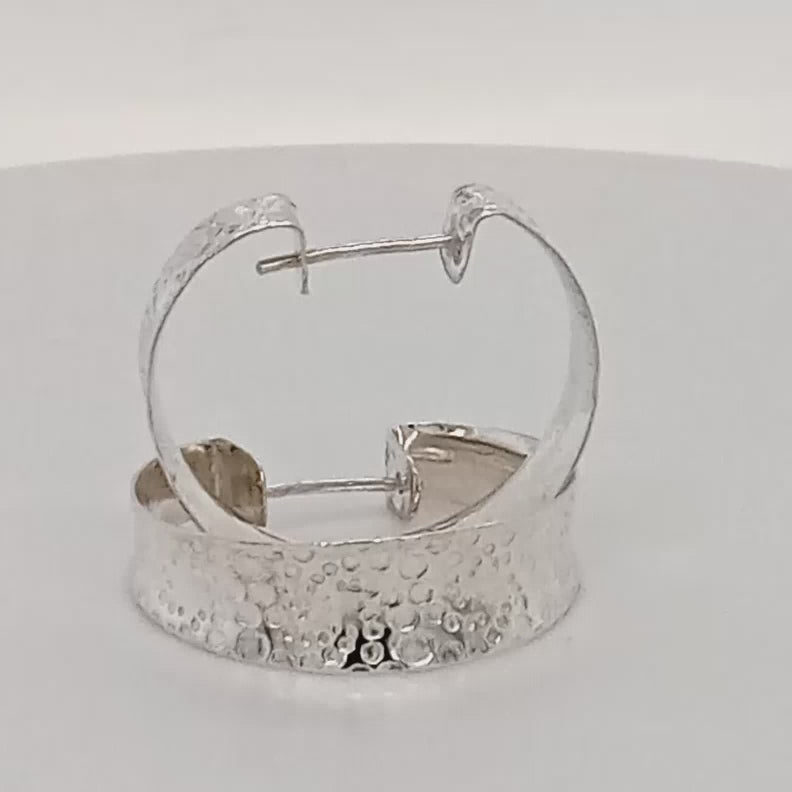 Elegant textured sterling silver hoop earrings. Etched in delicate patterns and hammered into concave hoops with built in tension posts. Unique handmade jewellery Canada.