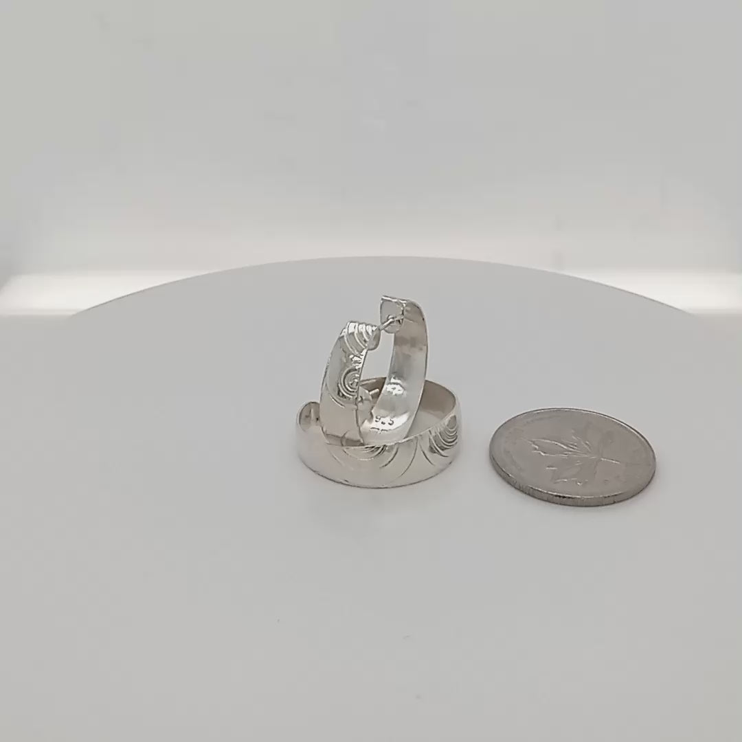 Hoop earrings sterling silver. Etched 92.5 silver in patterns of; ancient fan, graceful swirls, swirling dots, or concentric circles pattern. Handformed into synclastic hoops with tension posts. GemRapture Jewellery handmade artisan jewelry made in Canada.