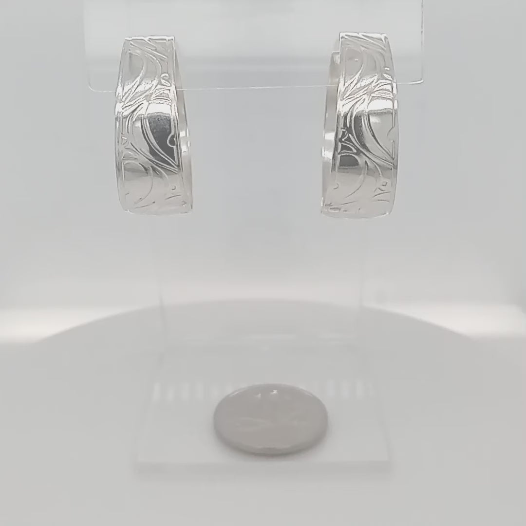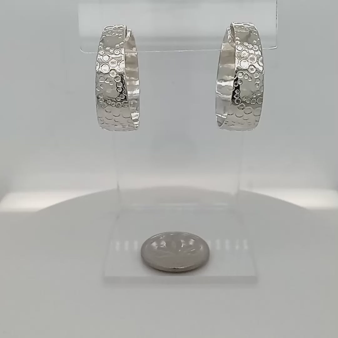 Sterling silver hoop earrings Canada 26mm silver etched and handformed into synclastic hoops tension posts GemRapture Jewellery handcrafted in Canada
