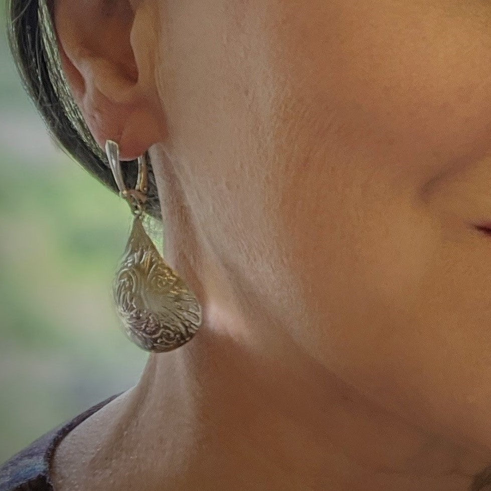 Limited Edition Series: KISS - Keep It Simple Sweetheart; Are a classic teardrop statement earrings. Designed with on-trend chunky form, sculpting along the jaw, dropping mid-way along the neck. Or create intrigue as they weave in and out of your hair. The depth of the electro-etchings makes this tactile earring a must have accessory. They are like rubbing a lucky penny! And give gentle kisses as they tap your neck! Teardrop Sterling Silver earrings etched with stylized patterns. Lever backs are elegantly finish the design, and keep the earring in place. Finished with a light patina to add depth and highlight the etching. Polished in satin to high gloss finishes. Unique handmade jewellery Canada.